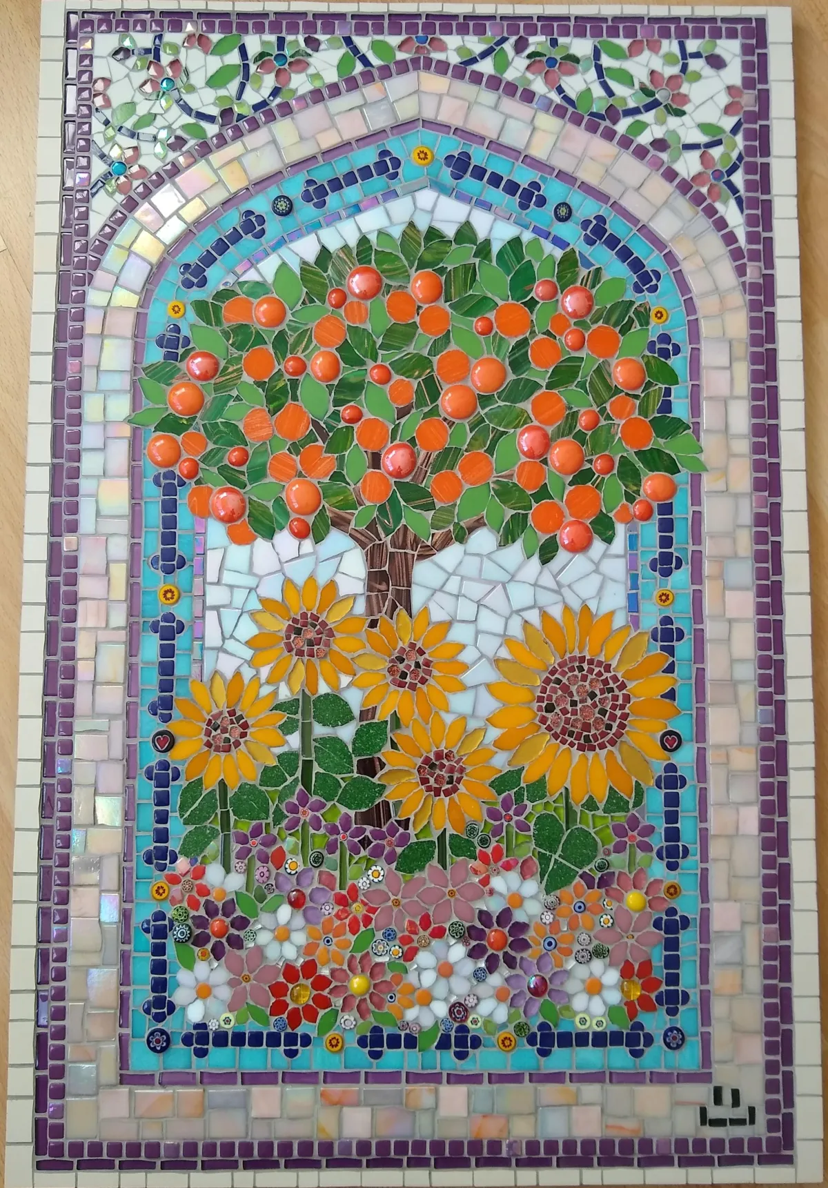 60cm x 40cm, this Indian theme mosaic was inspired by a traditional ornamental arch window filled with a bright orange tree and colourful flora. To reflect a warm and vibrant personality.